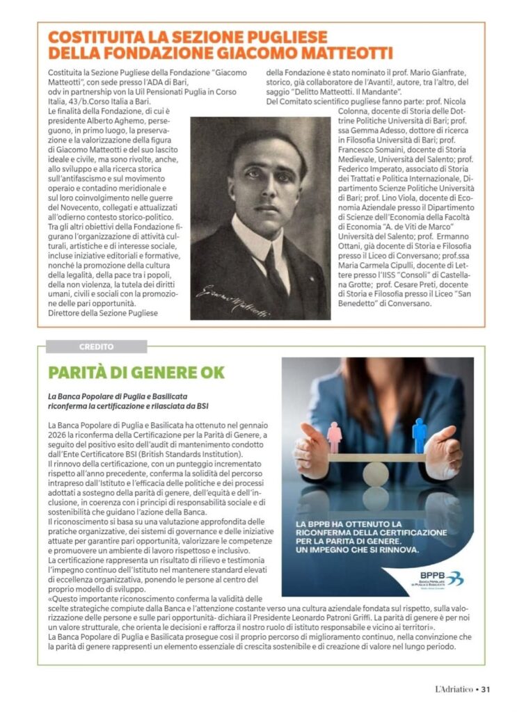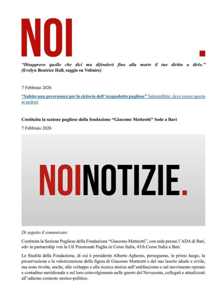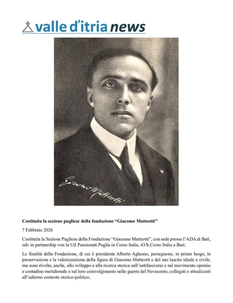 È stata costituita la Sezione Pugliese della Fondazione Giacomo Matteotti ETS. L’organismo regionale, che ha sede presso l’ADA di Bari, in Corso Italia 43/b, è diretto da Mario Gianfrate e si avvale della collaborazione di un qualificato comitato scientifico.