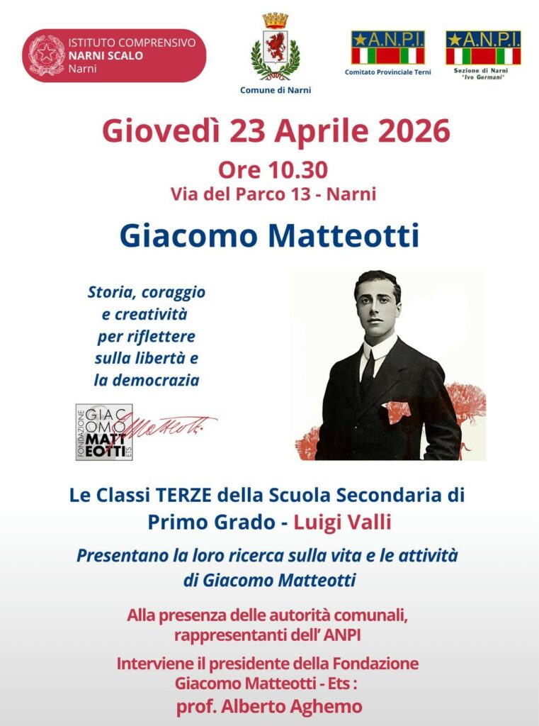 Giovedì 23 aprile 2026 alle 10:30 a Narni Scalo, in Via del Parco 13, si è tenuto l’incontro su Giacomo Matteotti con gli studenti e i docenti del locale istituto comprensivo “Luigi Valli”.