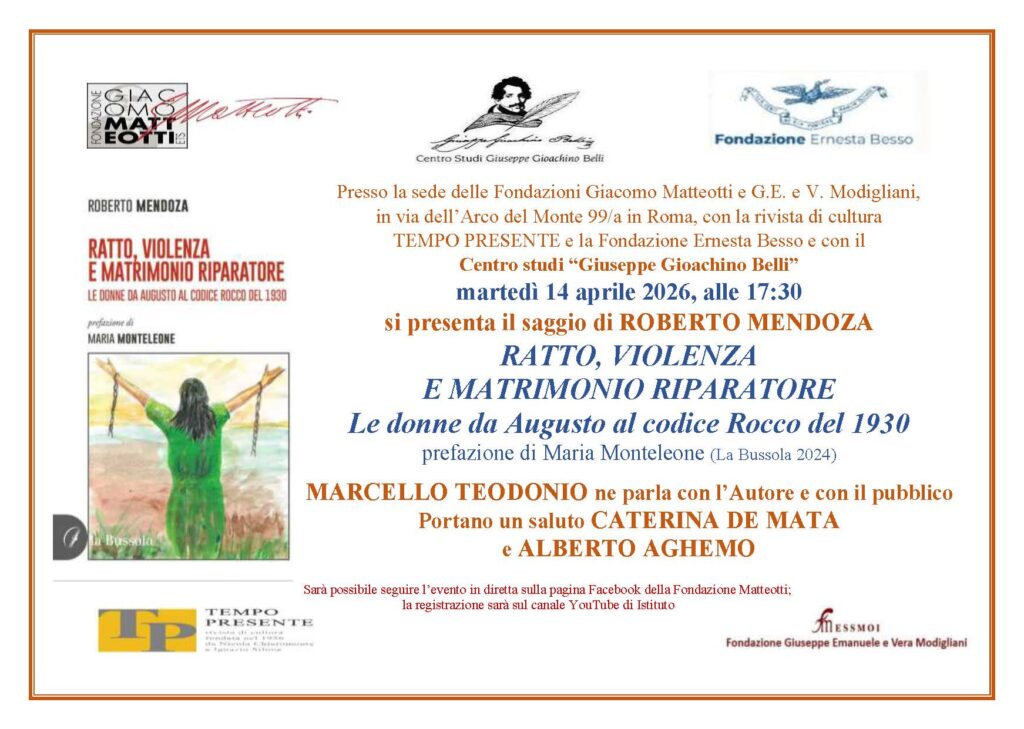 Martedì 14 aprile presso la sede di via dell’Arco del Monte 99/a in Roma, il Centro Studi Giuseppe Gioachino Belli in collaborazione con la Fondazione Giacomo Matteotti – ETS, con la Fondazione Ernesta Besso, con la rivista di cultura TEMPO PRESENTE e con la Fondazione Modigliani – ESSMOI presenta il saggio di Roberto Mendoza