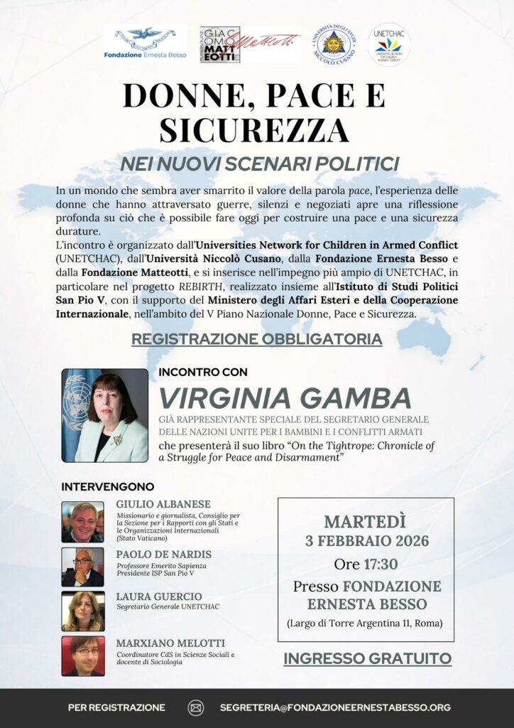 L’incontro è congiuntamente organizzato dalla Fondazione Ernesta Besso, da UNETCHAC, dalla Fondazione Giacomo Matteotti ETS e dall’Università degli studi Niccolò Cusano.