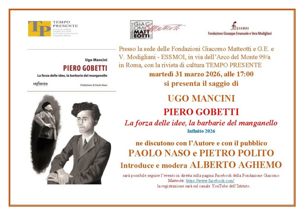 Martedì 31 marzo 2026 alle 17:00, nella sede di via dell’Arco del Monte 99/a in Roma, la Fondazione Giacomo Matteotti ETS, con la rivista di cultura TEMPO PRESENTE e con la Fondazione Modigliani – ESSMOI ha presentato il libro di Ugo Mancini