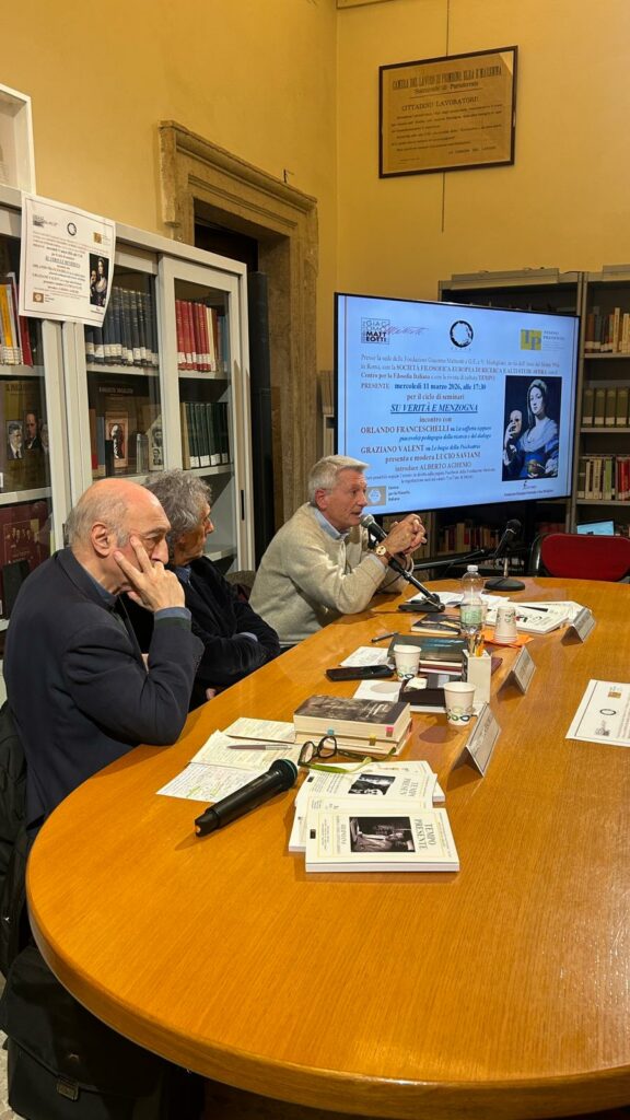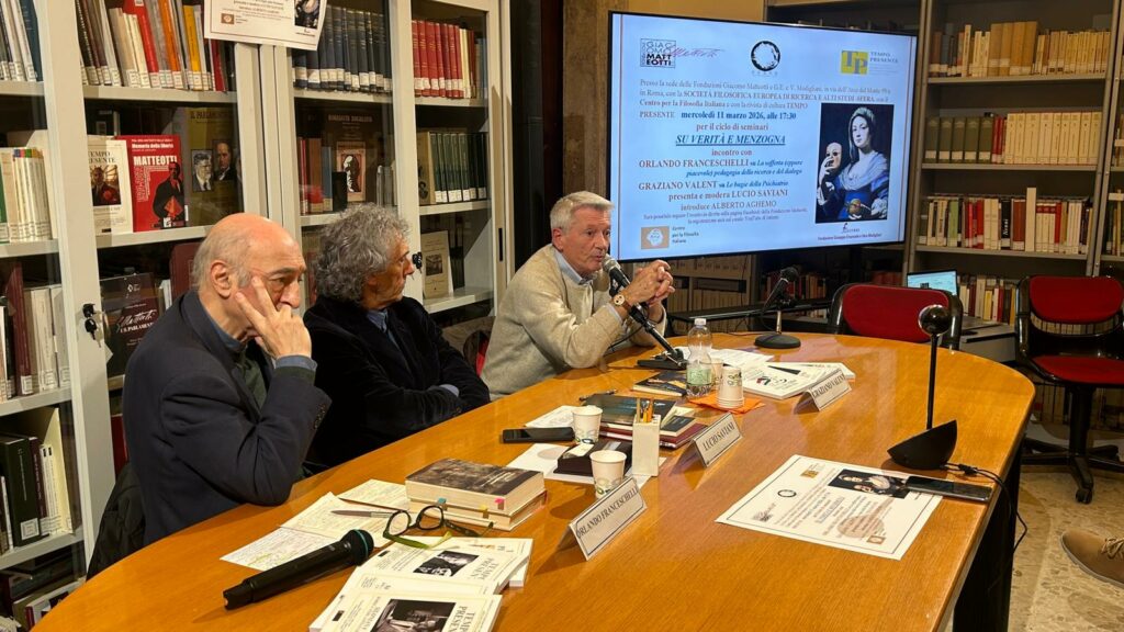 Mercoledì 11 marzo 2026, alle 17:30 la Fondazione Giacomo Matteotti e la Società Filosofica Europea di Ricerca e Alti Studi – SFERA, in collaborazione con la Rivista di cultura TEMPO PRESENTE, con il Centro per la Filosofia Italiana e con la Fondazione G.E. e V. Modigliani – ESSMOI – per il ciclo di seminari SU VERITÀ E MENZOGNA hanno presentato gli interventi di
