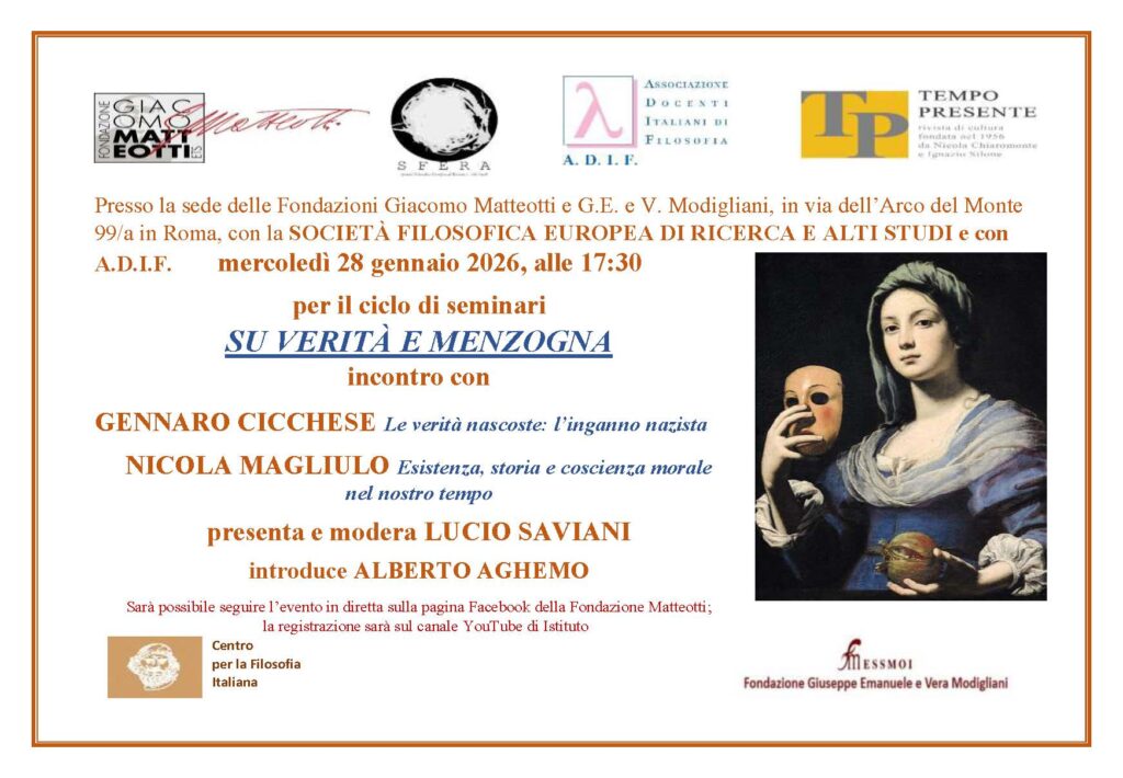 Mercoledì 28 gennaio 2026, alle 17:30 la Fondazione Giacomo Matteotti e la Società Filosofica Europea di Ricerca e Alti Studi – SFERA, in collaborazione con la Rivista di cultura TEMPO PRESENTE, con il Centro per la Filosofia Italiana e con la Fondazione G.E. e V. Modigliani – ESSMOI per il ciclo di seminari SU VERITÀ E MENZOGNA hanno presentato gli interventi di: