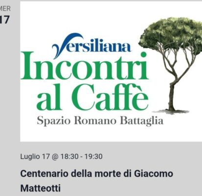 VERSILIANA incontri al caffè Matteotti100 – Mercoledì 17 luglio 2024, alle 18:30 nello Spazio Caffè, in viale Morin, 16, a Marina di Pietrasanta incontro su: MATTEOTTI E NOI. Una lezione di libertà