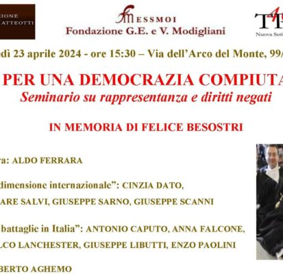 Martedì 23 aprile alle 15:30, presso la sede di Via dell’Arco del Monte 99/a in Roma si è tenuto l’evento PER UNA DEMOCRAZIA COMPIUTA. SEMINARIO SU RAPPRESENTANZA E DIRITTI NEGATI IN MEMORIA DI FELICE BESOSTRI