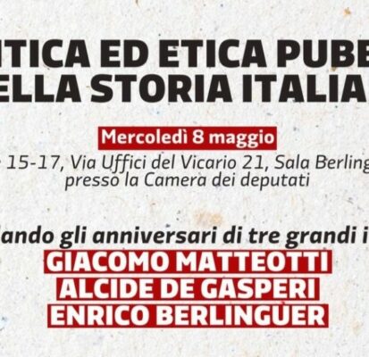 Mercoledì 8 maggio presso la sala Berlinguer della Camera dei deputati con ingresso da via Uffici del Vicario 21, dalle 15:00, RICORDANDO GLI ANNIVERSARI DI TRE GRANDI ITALIANI: GIACOMO MATTEOTTI, ALCIDE DE GASPERI ED ENRICO BERLINGUER