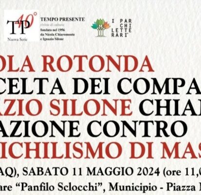 Sabato 11 maggio 2024 alle 11:00 a Pescina, presso il Municipio in Piazza Mazzarino, si tiene la tavola rotonda sul tema LA SCELTA DEI COMPAGNI: IGNAZIO SILONE CONTRO IL “NICHILISMO DI MASSA”
