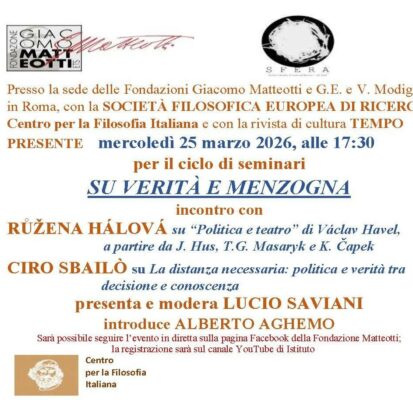 Mercoledì 25 marzo, alle 17:30 – per il ciclo di seminari SU VERITÀ E MENZOGNA – sono intervenuti RŮŽENA HÁLOVÁ, sul tema “Su ‘Politica e teatro’ di Václav Havel, a partire da J. Hus, T.G. Masaryk e K. Čapek” e CIRO SBAILÒ, sul tema “La distanza necessaria: politica e verità tra decisione e conoscenza”