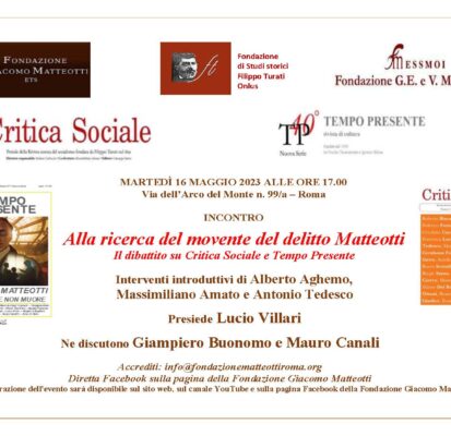 IL MOVENTE DEL DELITTO MATTEOTTI – La Fondazione Matteotti, insieme alle riviste “Critica Sociale” e “Tempo Presente” e in collaborazione con le Fondazioni di Studi storici Filippo Turati e G.E. e V. Modigliani-ESSMOI, organizza MARTEDÌ 16 MAGGIO ALLE 17 a Roma, nella sede di Via dell’Arco del Monte 99/a
