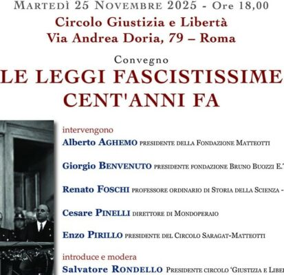 Martedì 25 novembre, presso il Circolo Giustizia e Libertà di Roma, convegno su “LE LEGGI FASCISTISSIME CENT’ANNI FA”