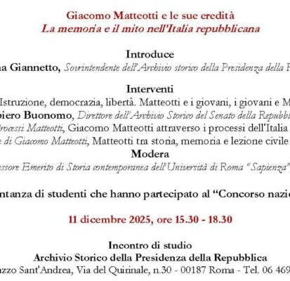 Giovedì 11 dicembre 2025 l’Archivio Storico della Presidenza della Repubblica ha promosso, a Palazzo Sant’Andrea in Via del Quirinale 30 a Roma, un incontro di studio sul tema: GIACOMO MATTEOTTI E LE SUE EREDITÀ. La memoria e il mito nell’Italia repubblicana
