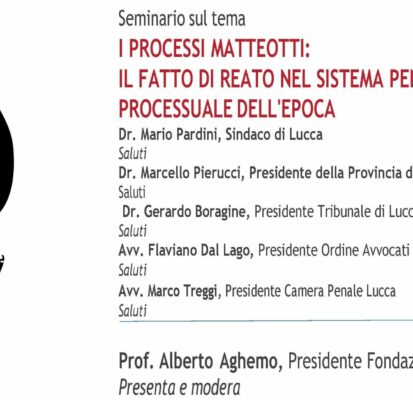 Venerdì 16 maggio 2025 alle 10:30 presso la Sala Tobino del Palazzo Ducale di Lucca si tiene il seminario sul tema I PROCESSI MATTEOTTI: IL FATTO DI REATO NEL SISTEMA PENALE E PROCESSUALE DELL’EPOCA