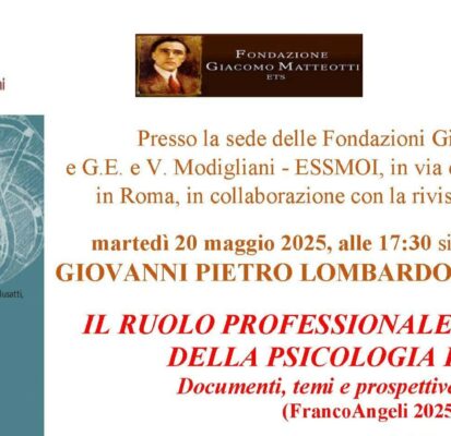 Martedì 20 maggio 2025, alle 17:30 presso la sede delle Fondazioni Giacomo Matteotti e G.E. e V. Modigliani – ESSMOI, in via dell’Arco del Monte 99/a in Roma, in collaborazione con la rivista «Tempo Presente», presentato il volume di Giovanni Pietro Lombardo e Pietro Stampa IL RUOLO PROFESSIONALE NELLA STORIA DELLA PSICOLOGIA ITALIANA. Documenti, temi e prospettive di sviluppo (FrancoAngeli 2025)