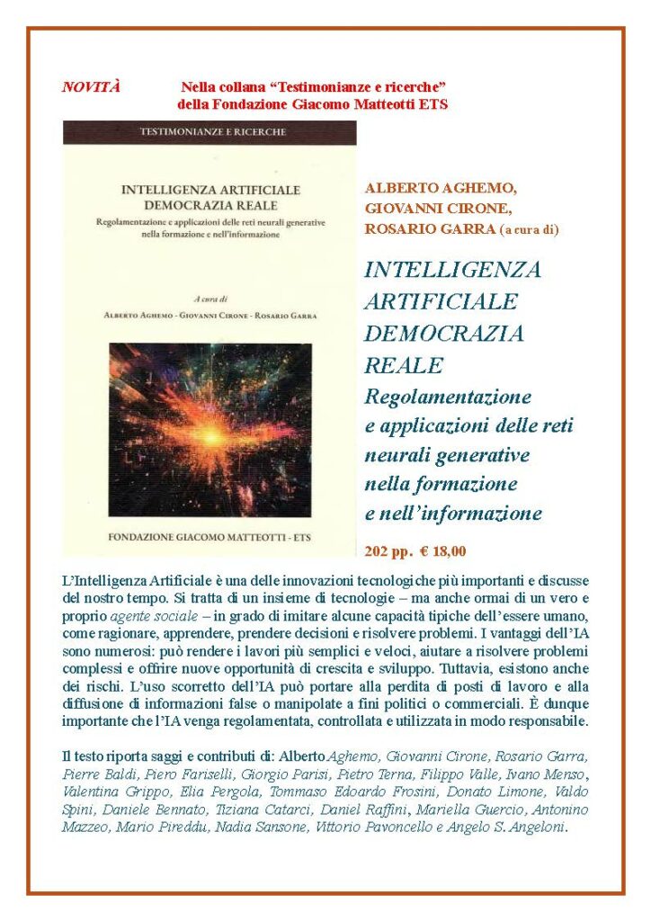 NOVITÀ EDITORIALE – È uscito il libro INTELLIGENZA ARTIFICIALE DEMOCRAZIA REALE. Regolamentazione e applicazioni delle reti neurali generative nella formazione e nell’informazione a cura di Alberto Aghemo, Giovanni Cirone e Rosario Garra