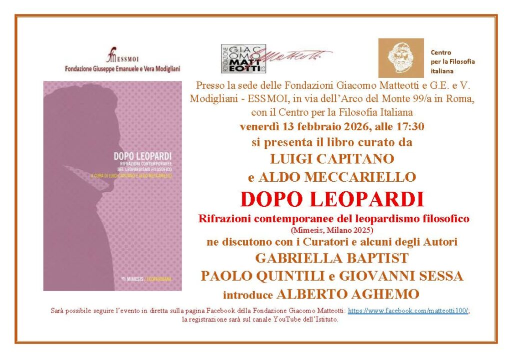 Venerdì 13 febbraio 2026 alle 17:30 presso la sede delle Fondazioni Giacomo Matteotti e G.E. e V. Modigliani – ESSMOI con Il Centro per la Filosofia Italiana presentato il libro